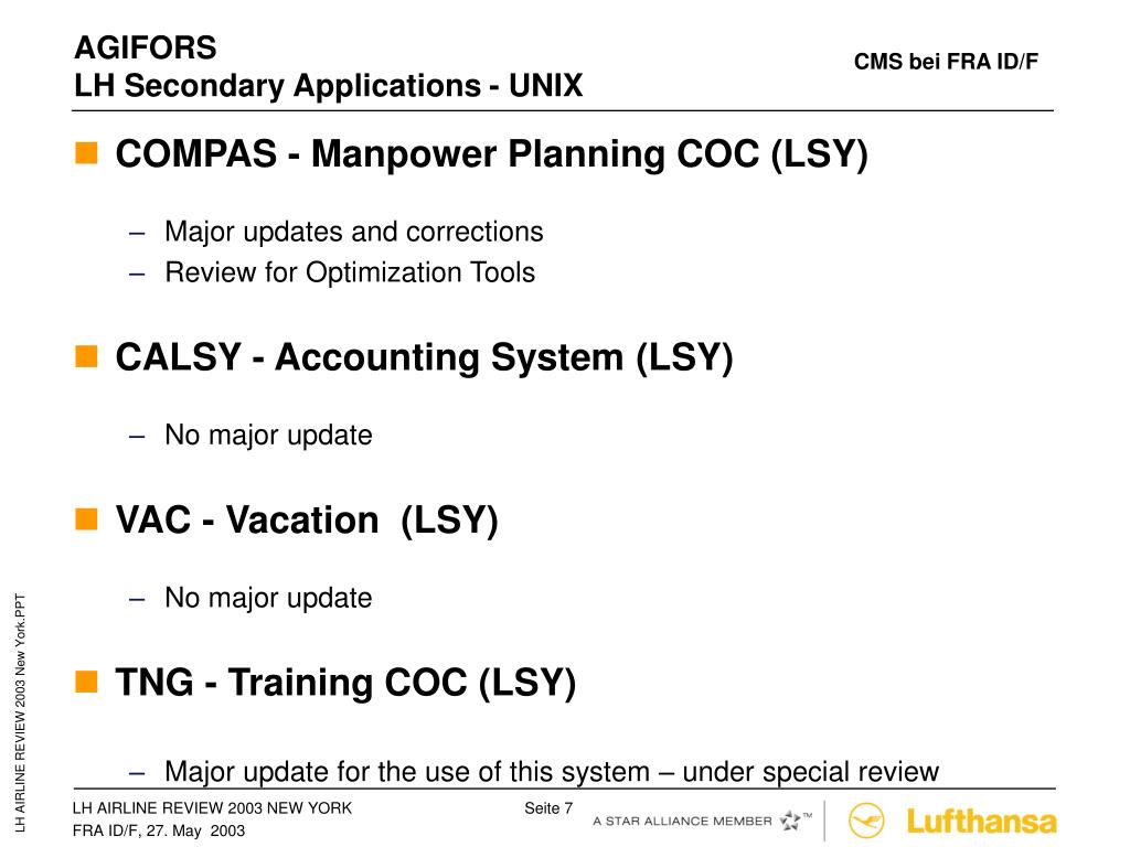 AGIFORSLH Secondary Applications - UNIX CMS bei FRA ID/F • COMPAS - Manpower Planning COC (LSY) • Major updates and corrections • Review for Optimization Tools • CALSY - Accounting System (LSY) • No major update • VAC - Vacation (LSY) • No major update • TNG - Training COC (LSY) • Major update for the use of this system – under special review