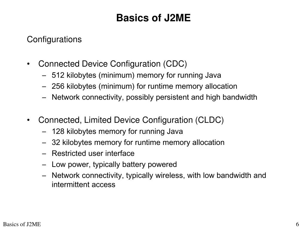 Basics of J2ME Configurations “Configurations comprise a virtual machine and a minimal set of class libraries. They provide the base functionality for a particular range of devices that share similar characteristics, such as network connectivity and memory footprint. Currently, there are two J2ME configurations: the Connected Limited Device Configuration (CLDC) and the Connected Device Configuration (CDC). “