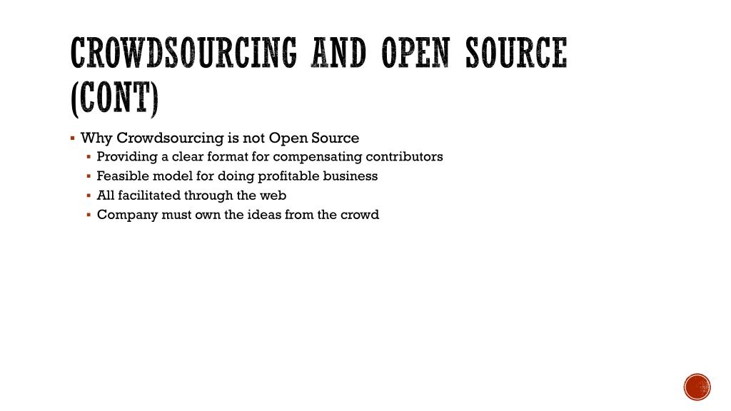 Crowdsourcing and Open Source (cont) • Why Crowdsourcing is not Open Source • Providing a clear format for compensating contributors • Feasible model for doing profitable business • All facilitated through the web • Company must own the ideas from the crowd