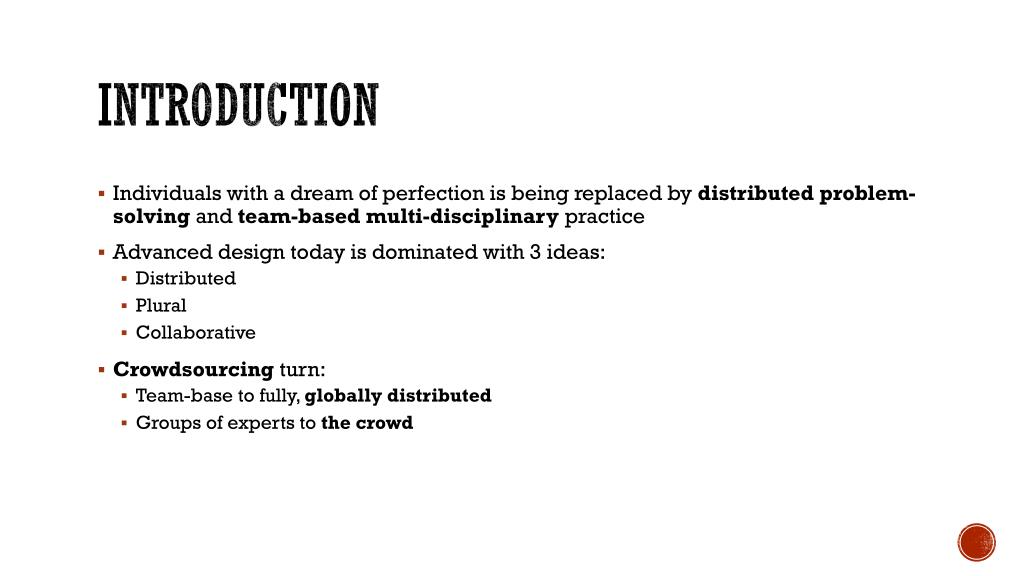 Introduction • Individuals with a dream of perfection is being replaced by distributed problem-solving and team-based multi-disciplinary practice • Advanced design today is dominated with 3 ideas: • Distributed • Plural • Collaborative • Crowdsourcingturn: • Team-base to fully, globally distributed • Groups of experts to the crowd
