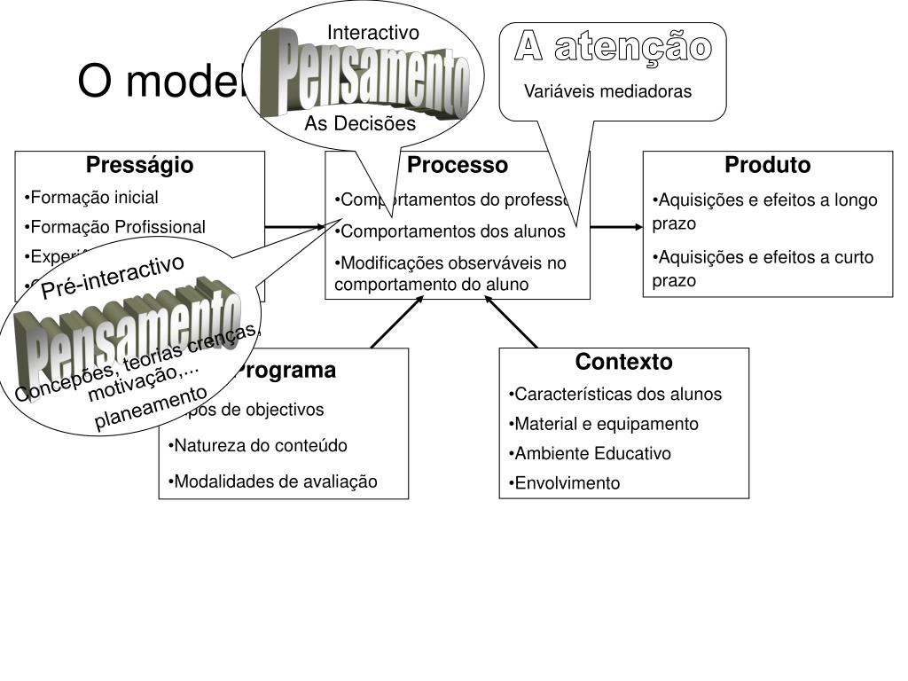 Interactivo A atenção Pensamento O modelo de Mitzel Variáveis mediadoras As Decisões • Presságio • Formação inicial • Formação Profissional • Experiência profissional • Conhecimentos • Processo • Comportamentos do professor • Comportamentos dos alunos • Modificações observáveis no comportamento do aluno • Produto • Aquisições e efeitos a longo prazo • Aquisições e efeitos a curto prazo Pré-interactivo Pensamento Concepões, teorias crenças, motivação,... planeamento • Contexto • Características dos alunos • Material e equipamento • Ambiente Educativo • Envolvimento • Programa • Tipos de objectivos • Natureza do conteúdo • Modalidades de avaliação