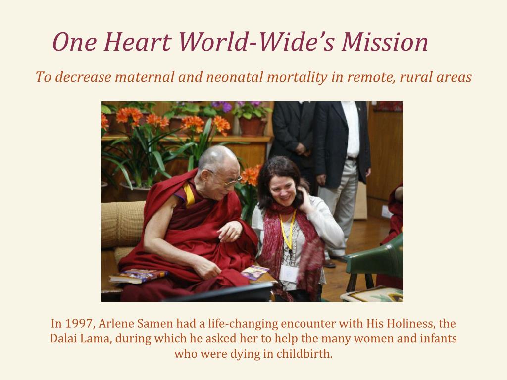 To decrease maternal and neonatal mortality in remote, rural areas One Heart World-Wide’s Mission In 1997, Arlene Samen had a life-changing encounter with His Holiness, the Dalai Lama, during which he asked her to help the many women and infants who were dying in childbirth.