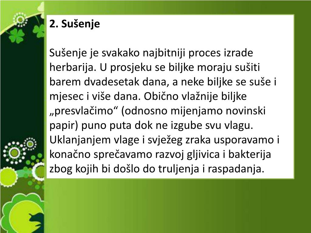 2. Sušenje Sušenje je svakako najbitniji proces izrade herbarija. U prosjeku se biljke moraju sušiti barem dvadesetak dana, a neke biljke se suše i mjesec i više dana. Obično vlažnije biljke „presvlačimo“ (odnosno mijenjamo novinski papir) puno puta dok ne izgube svu vlagu. Uklanjanjem vlage i svježeg zraka usporavamo i konačno sprečavamo razvoj gljivica i bakterija zbog kojih bi došlo do truljenja i raspadanja.