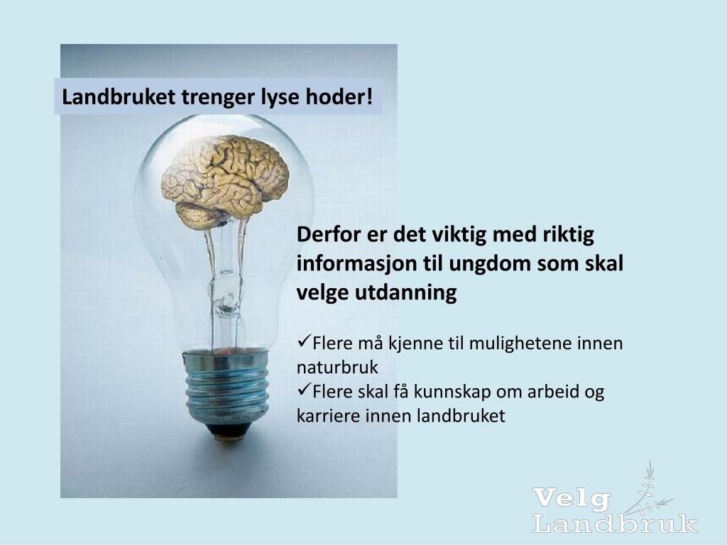 Landbruket trenger lyse hoder! • Derfor er det viktig med riktig informasjon til ungdom som skal velge utdanning • Flere må kjenne til mulighetene innen naturbruk • Flere skal få kunnskap om arbeid og karriere innen landbruket