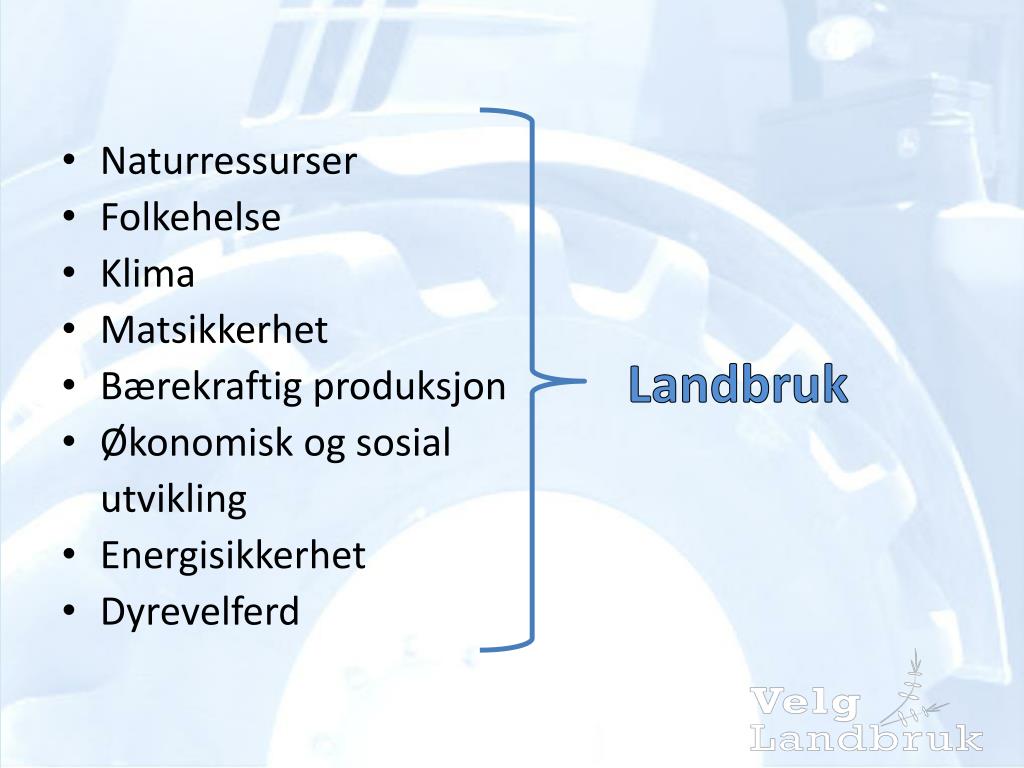 Naturressurser • Folkehelse • Klima • Matsikkerhet • Bærekraftig produksjon • Økonomisk og sosial utvikling • Energisikkerhet • Dyrevelferd Landbruk