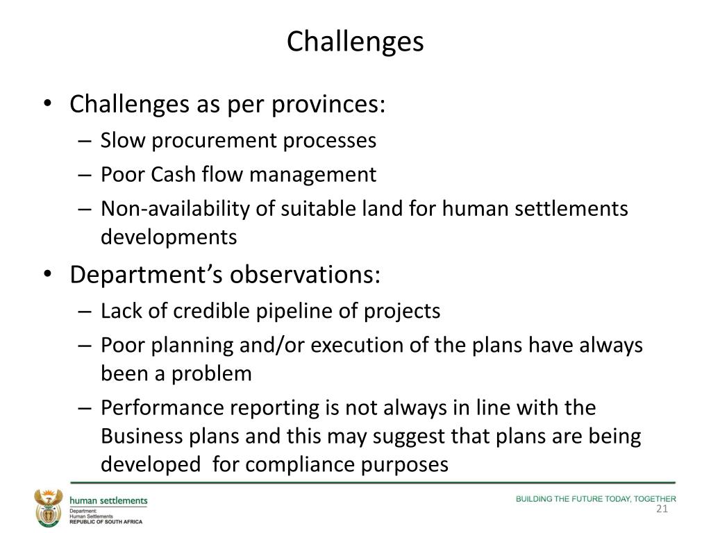Challenges • Challenges as per provinces: • Slow procurement processes • Poor Cash flow management • Non-availability of suitable land for human settlements developments • Department’s observations: • Lack of credible pipeline of projects • Poor planning and/or execution of the plans have always been a problem • Performance reporting is not always in line with the Business plans and this may suggest that plans are being developed for compliance purposes