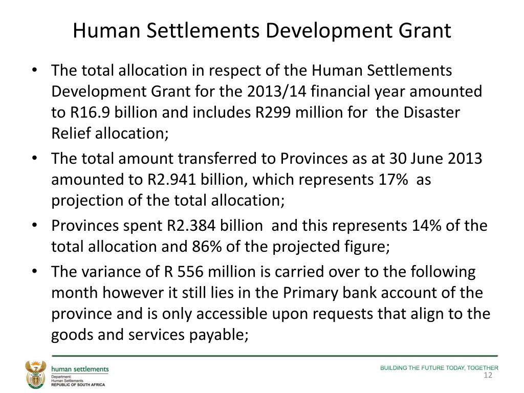 Human Settlements Development Grant • The total allocation in respect of the Human Settlements Development Grant for the 2013/14 financial year amounted to R16.9 billion and includes R299 million for the Disaster Relief allocation; • The total amount transferred to Provinces as at 30 June 2013 amounted to R2.941 billion, which represents 17% as projection of the total allocation; • Provinces spent R2.384 billion and this represents 14% of the total allocation and 86% of the projected figure; • The variance of R 556 million is carried over to the following month however it still lies in the Primary bank account of the province and is only accessible upon requests that align to the goods and services payable;