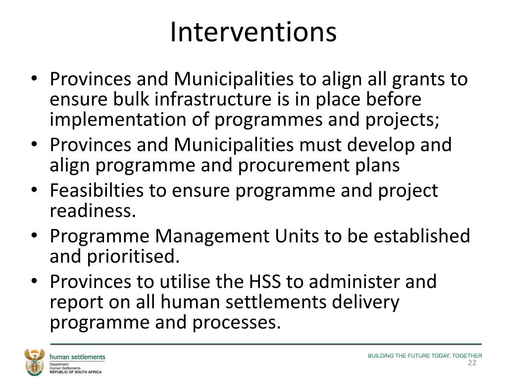 Interventions • Provinces and Municipalities to align all grants to ensure bulk infrastructure is in place before implementation of programmes and projects; • Provinces and Municipalities must develop and align programme and procurement plans • Feasibilties to ensure programme and project readiness. • Programme Management Units to be established and prioritised. • Provinces to utilise the HSS to administer and report on all human settlements delivery programme and processes.
