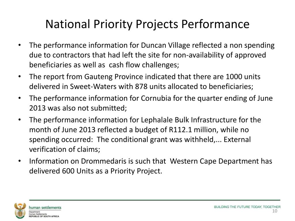 National Priority Projects Performance • The performance information for Duncan Village reflected a non spending due to contractors that had left the site for non-availability of approved beneficiaries as well as cash flow challenges; • The report from Gauteng Province indicated that there are 1000 units delivered in Sweet-Waters with 878 units allocated to beneficiaries; • The performance information for Cornubia for the quarter ending of June 2013 was also not submitted; • The performance information for Lephalale Bulk Infrastructure for the month of June 2013 reflected a budget of R112.1 million, while no spending occurred: The conditional grant was withheld,... External verification of claims; • Information on Drommedaris is such that Western Cape Department has delivered 600 Units as a Priority Project.