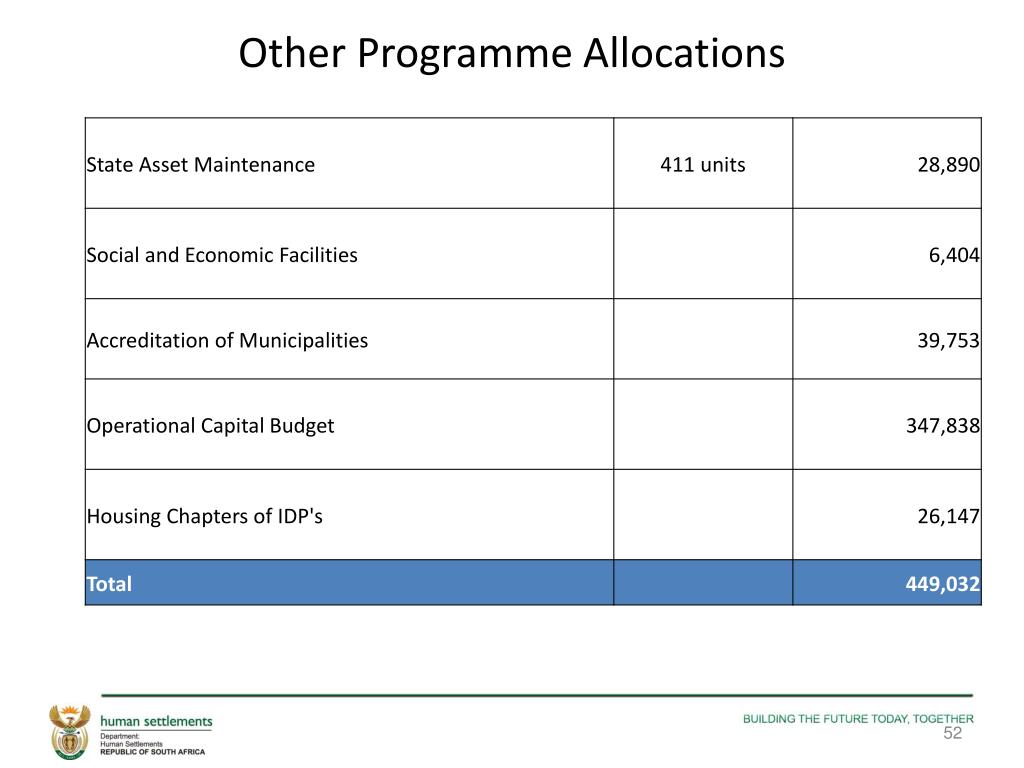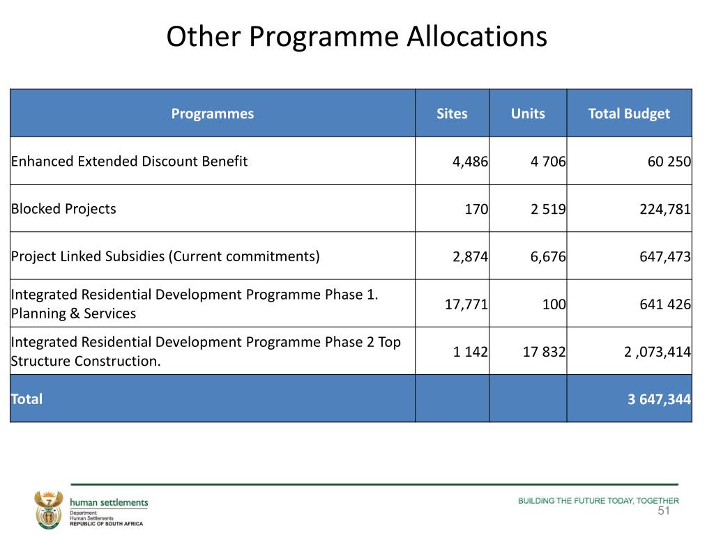 Introductory Remarks cont, • The Department has been allocated a budget of R28, 1 in 2013 financial year of which 16, 9 billion is directed to the Human Settlement Development Grant and 9, 1 billion representing an Urban Settlement Department Grant. The different catering for other programmes including the Rural Household Infrastructure Grant and the operational budget. • Within the allocation of 16, 9 billion is an earmarked allocation of 299 million for Disaster Relief Grant for disaster stricken areas