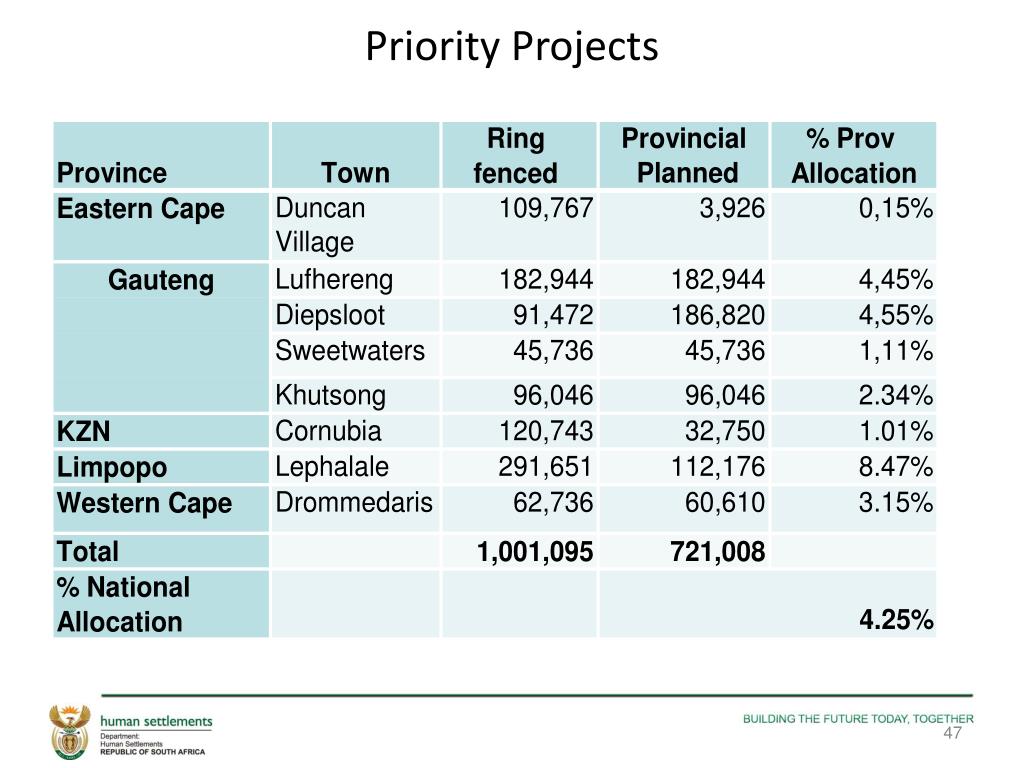Other milestones cont. • Blocked projects are incomplete projects that were stalled for various reasons. Funds are provided to unblock these projects and Provinces have spent 10% of their allocation in the first quarter. • Suitable land is identified for human settlements development and Provinces allocated funds for the acquisition of land through the Housing Development Agency.; • Of the R78 million allocated Provinces only R4 million was used for the procurement of land;