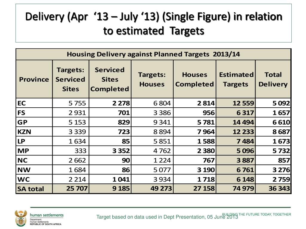 Delivery (Apr ‘13 – July ‘13) (Single Figure) in relation to estimated Targets Target based on data used in Dept Presentation, 05 June 2013