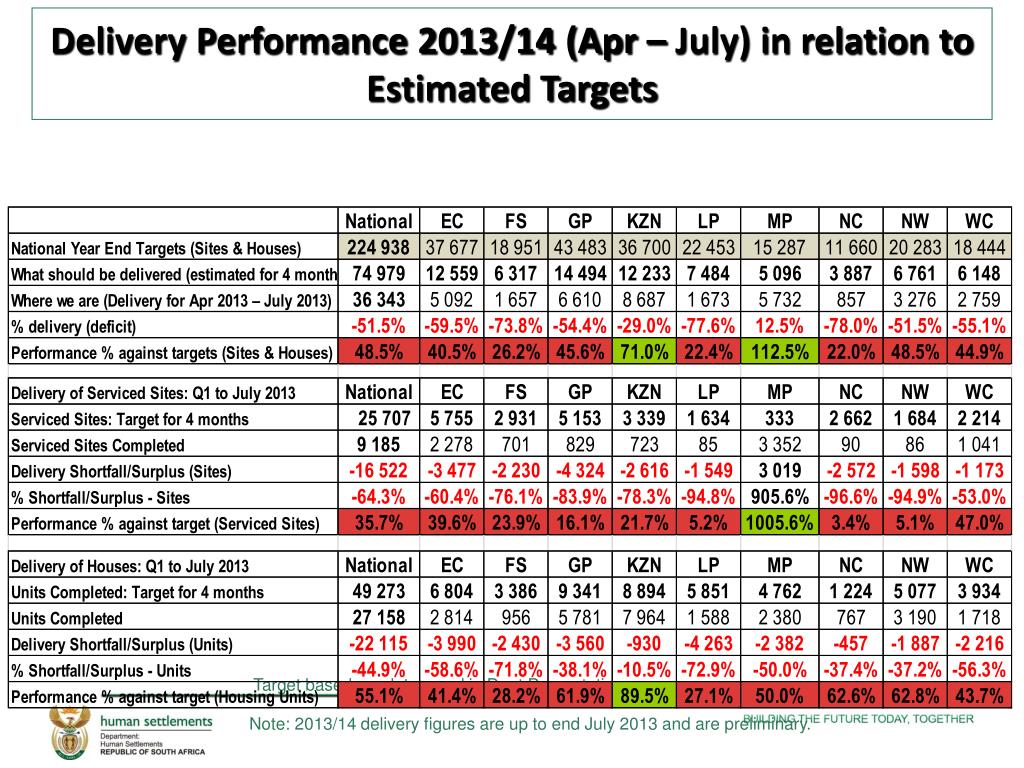 Delivery Performance 2013/14 (Apr – July) in relation to Estimated Targets Target based on data used in Dept Presentation Note: 2013/14 delivery figures are up to end July 2013 and are preliminary.