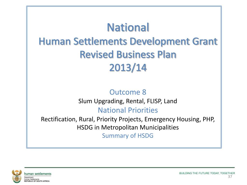 NationalHuman Settlements Development GrantRevised Business Plan2013/14Outcome 8Slum Upgrading, Rental, FLISP, LandNational PrioritiesRectification, Rural, Priority Projects, Emergency Housing, PHP, HSDG in Metropolitan MunicipalitiesSummary of HSDG