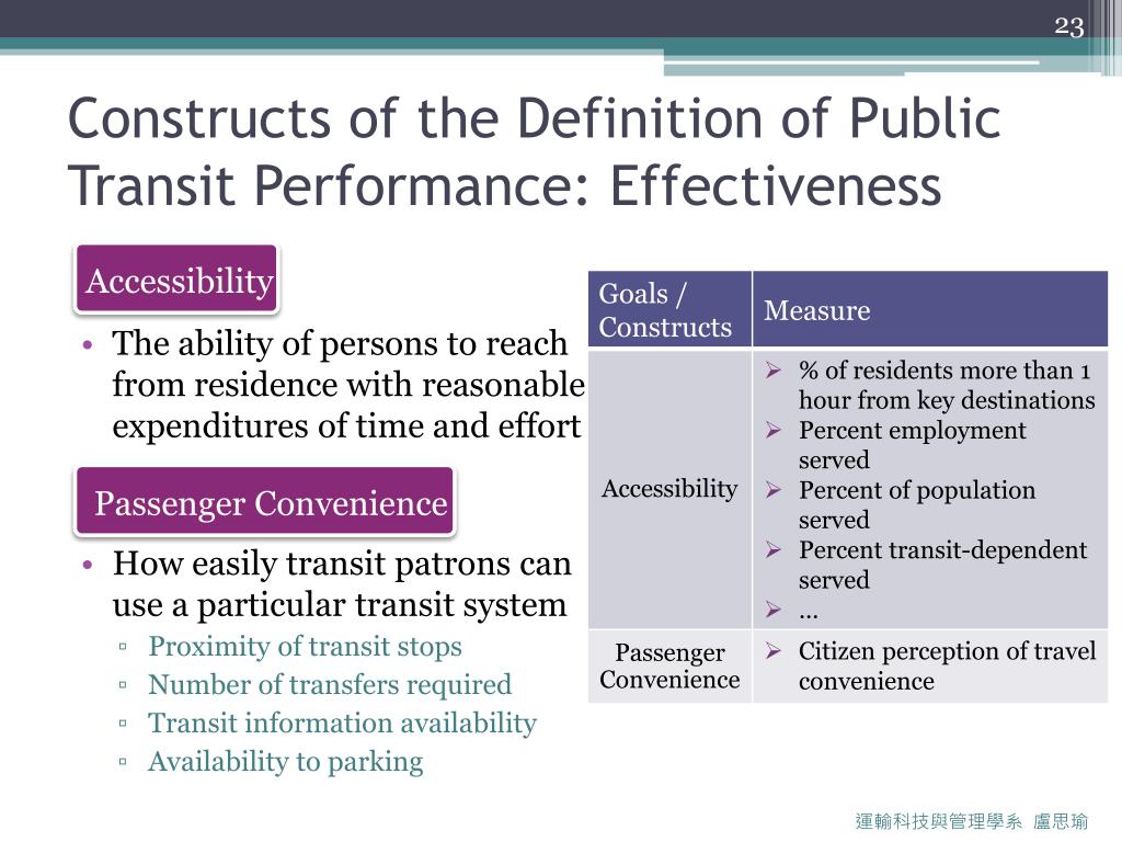 Constructs of the Definition of Public Transit Performance: Impact 運輸科技與管理學系 盧思瑜