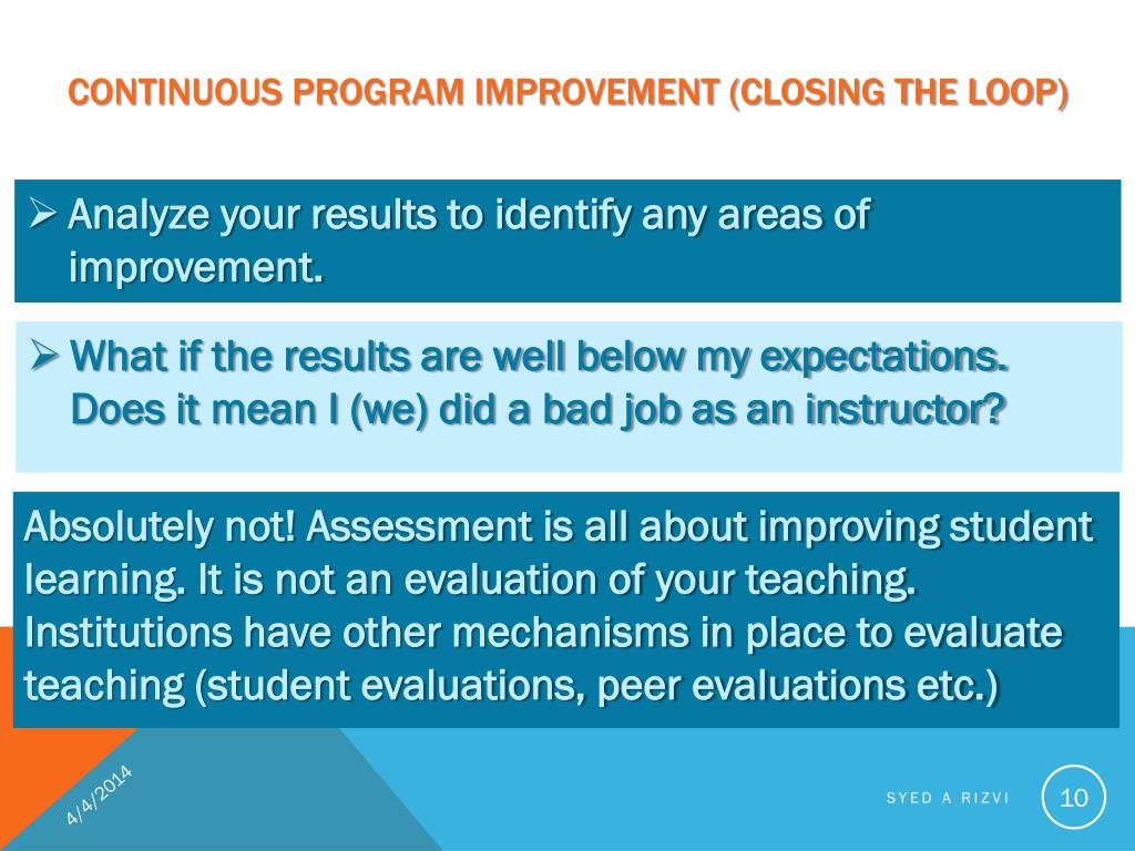 Continuous Program improvement (closing the loop) Analyze your results to identify any areas of improvement. What if the results are well below my expectations. Does it mean I (we) did a bad job as an instructor? Absolutely not! Assessment is all about improving student learning. It is not an evaluation of your teaching. Institutions have other mechanisms in place to evaluate teaching (student evaluations, peer evaluations etc.) Syed A Rizvi