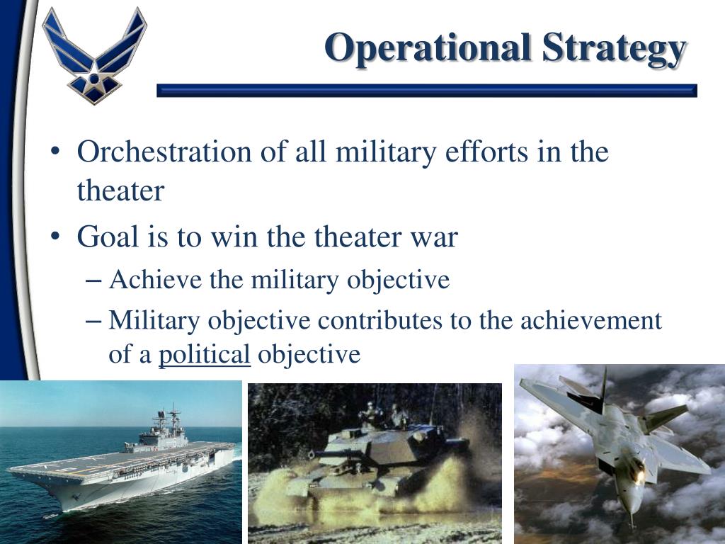 Operational Strategy • Orchestration of all military efforts in the theater • Goal is to win the theater war • Achieve the military objective • Military objective contributes to the achievement of a political objective