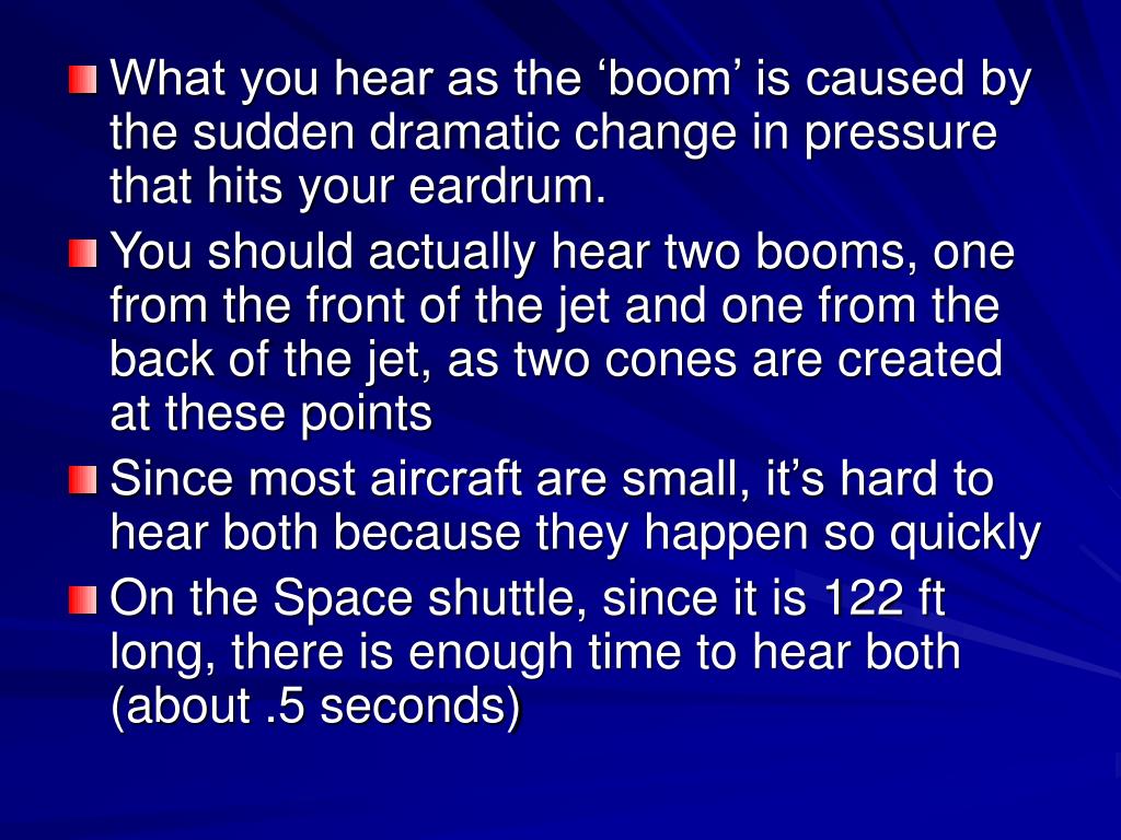 What you hear as the ‘boom’ is caused by the sudden dramatic change in pressure that hits your eardrum. • You should actually hear two booms, one from the front of the jet and one from the back of the jet, as two cones are created at these points • Since most aircraft are small, it’s hard to hear both because they happen so quickly • On the Space shuttle, since it is 122 ft long, there is enough time to hear both (about .5 seconds)