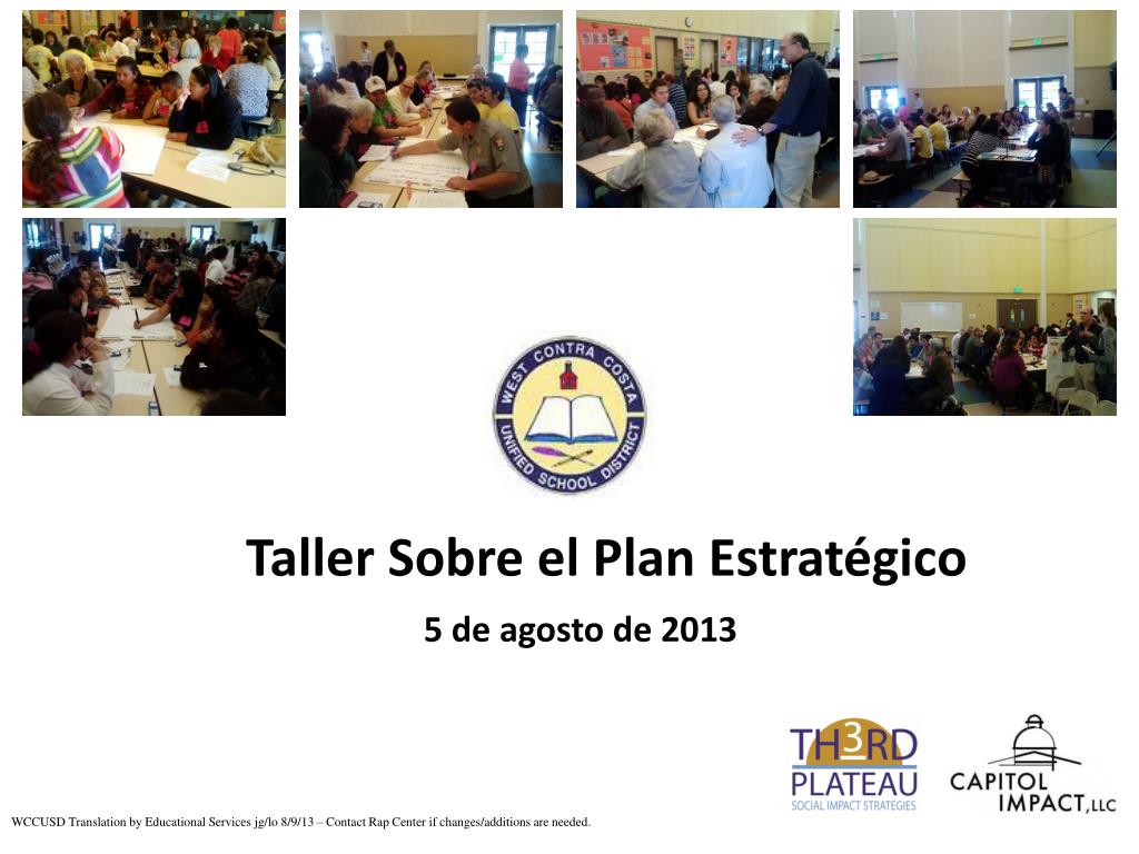Taller Sobre el Plan Estratégico 5 de agosto de 2013 WCCUSD Translation by Educational Services jg/lo 8/9/13 – Contact Rap Center if changes/additions are needed.