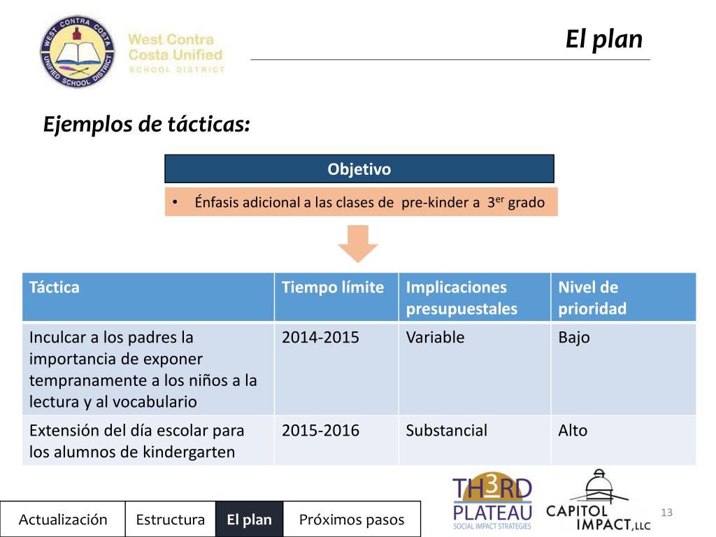 El plan Ejemplos de tácticas: Objetivo • Énfasis adicional a las clases de pre-kinder a 3er grado Actualización Estructura El plan Próximos pasos