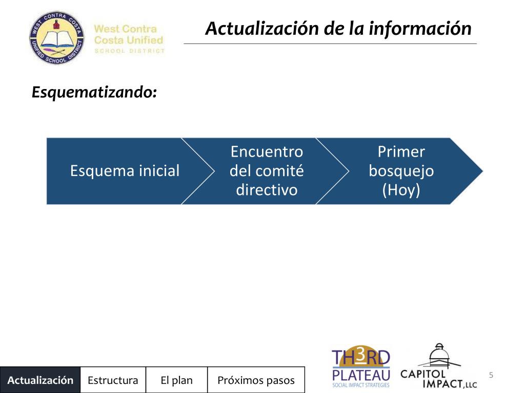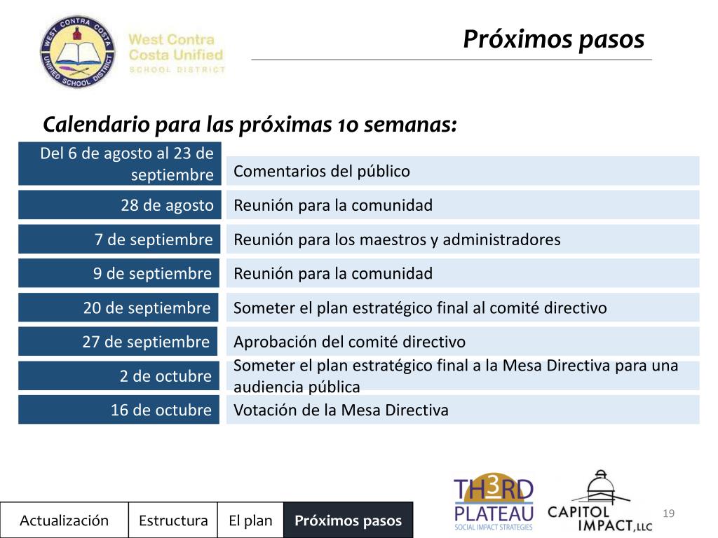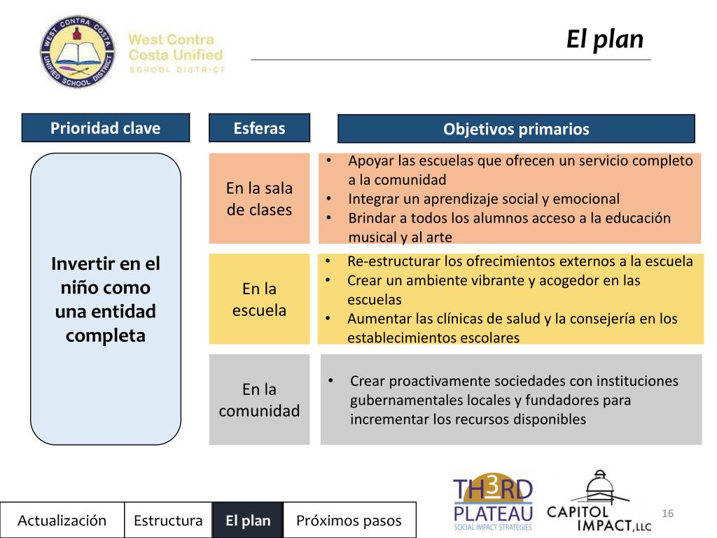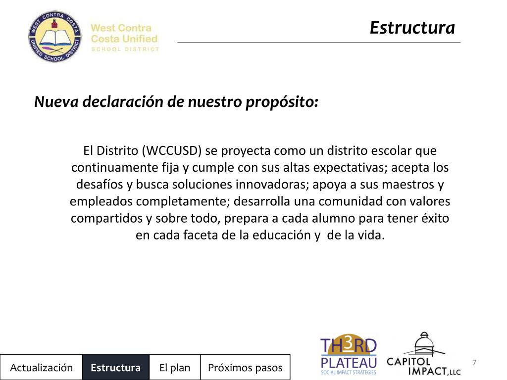 Estructura Nueva declaración de nuestro propósito: El Distrito (WCCUSD) se proyecta como un distrito escolar que continuamente fija y cumple con sus altas expectativas; acepta los desafíos y busca soluciones innovadoras; apoya a sus maestros y empleados completamente; desarrolla una comunidad con valores compartidos y sobre todo, prepara a cada alumno para tener éxito en cada faceta de la educación y de la vida. Actualización Estructura El plan Próximos pasos