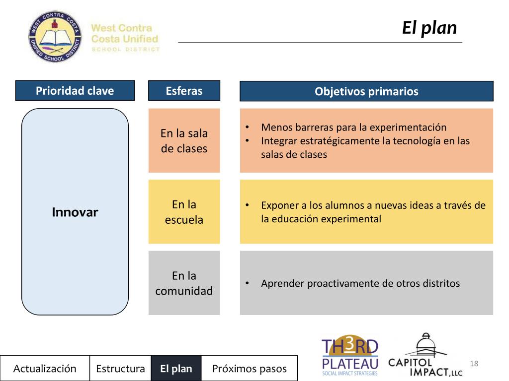 El plan Prioridad clave Esferas Objetivos primarios Innovar En la sala de clases • Menos barreras para la experimentación • Integrar estratégicamente la tecnología en las salas de clases En la escuela • Exponer a los alumnos a nuevas ideas a través de la educación experimental En la comunidad • Aprender proactivamente de otros distritos Actualización Estructura El plan Próximos pasos