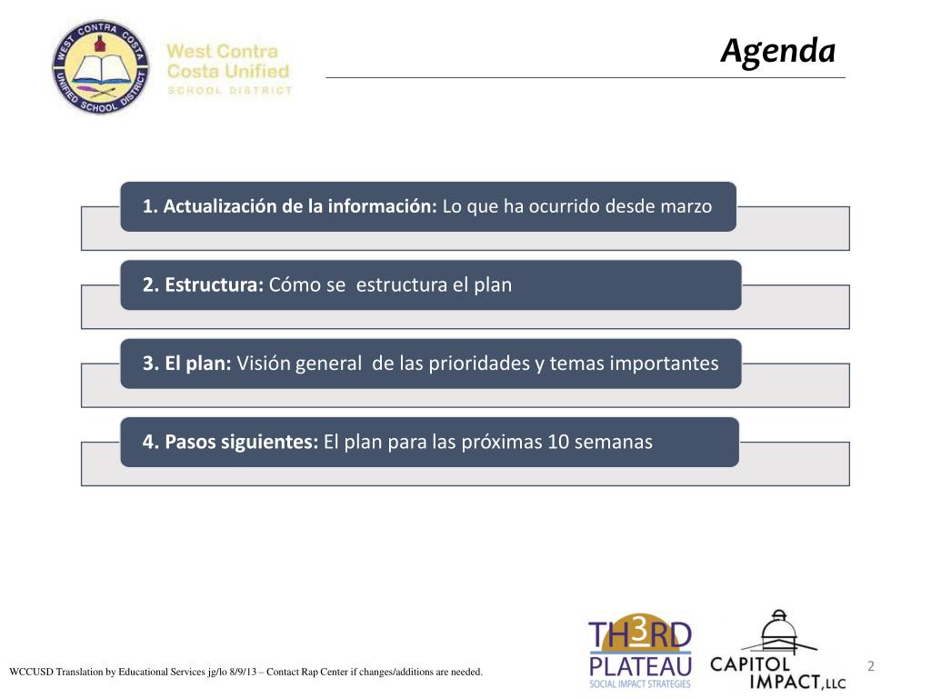 Agenda • 1. Actualización de la información: Lo que ha ocurrido desde marzo • 2. Estructura: Cómo se estructura el plan • 3. El plan: Visión general de las prioridades y temas importantes • 4. Pasos siguientes: El plan para las próximas 10 semanas WCCUSD Translation by Educational Services jg/lo 8/9/13 – Contact Rap Center if changes/additions are needed.