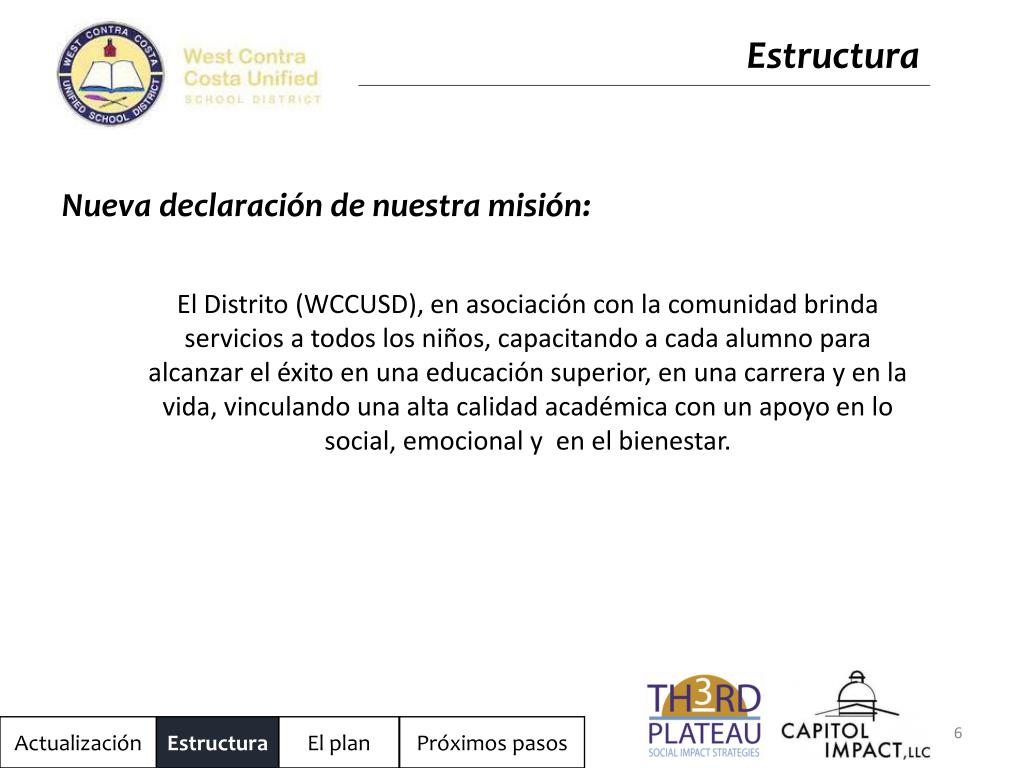 Estructura Nueva declaración de nuestra misión: El Distrito (WCCUSD), en asociación con la comunidad brinda servicios a todos los niños, capacitando a cada alumno para alcanzar el éxito en una educación superior, en una carrera y en la vida, vinculando una alta calidad académica con un apoyo en lo social, emocional y en el bienestar. Actualización Estructura El plan Próximos pasos
