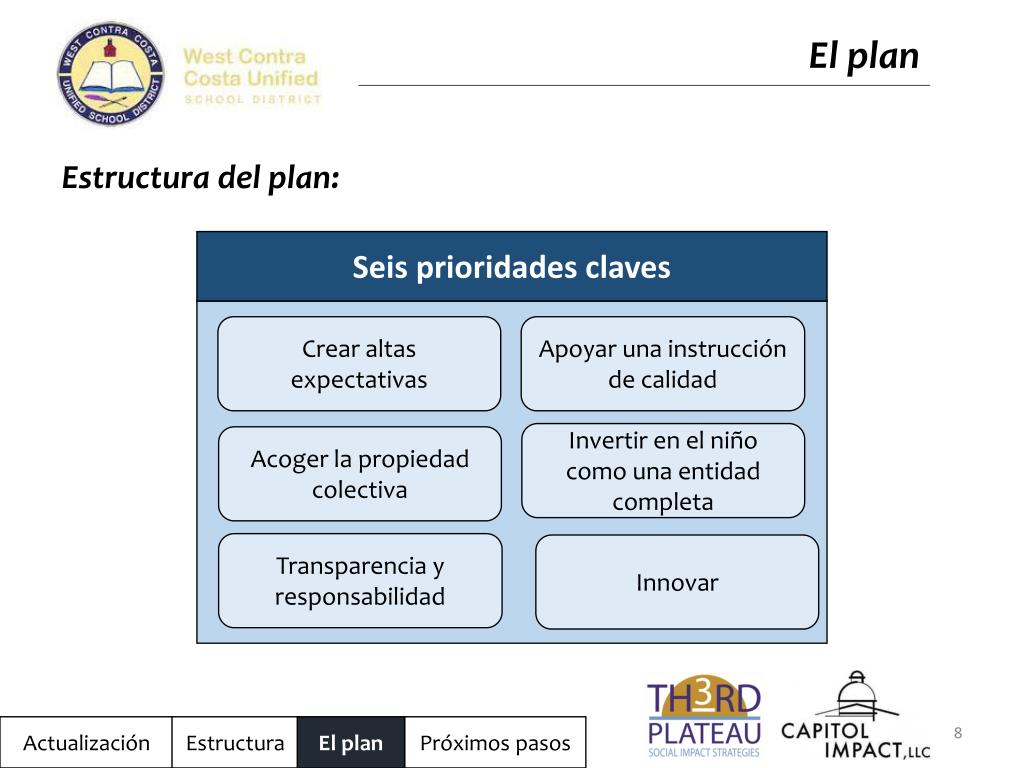 El plan Estructura del plan: Seis prioridades claves Crear altas expectativas Apoyar una instrucción de calidad Invertir en el niño como una entidad completa Acoger la propiedadcolectiva Transparencia y responsabilidad Innovar Actualización Estructura El plan Próximos pasos