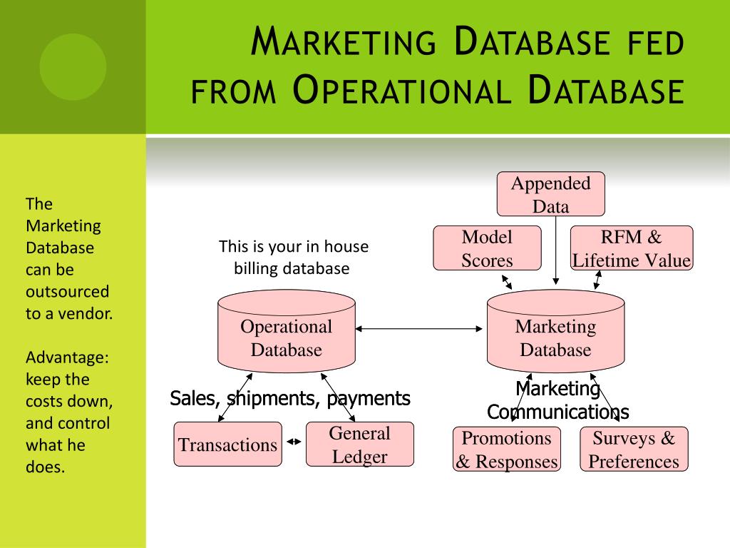 Marketing Database fed from Operational Database The Marketing Database can be outsourced to a vendor. Advantage: keep the costs down, and control what he does. This is your in house billing database