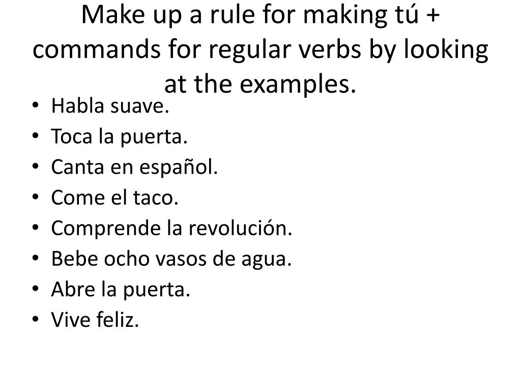 Make up a rule for making tú + commands for regular verbs by looking at the examples. • Habla suave. • Toca la puerta. • Canta en español. • Come el taco. • Comprende la revolución. • Bebeochovasos de agua. • Abre la puerta. • Vive feliz.