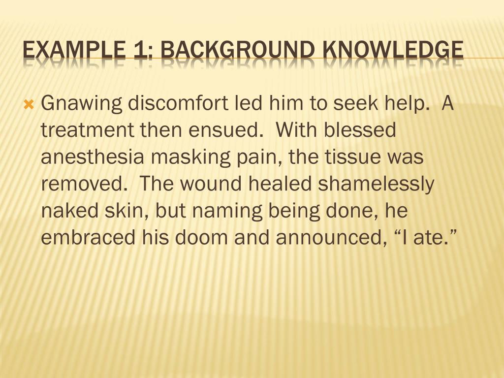Gnawing discomfort led him to seek help. A treatment then ensued. With blessed anesthesia masking pain, the tissue was removed. The wound healed shamelessly naked skin, but naming being done, he embraced his doom and announced, “I ate.” Example 1: Background knowledge