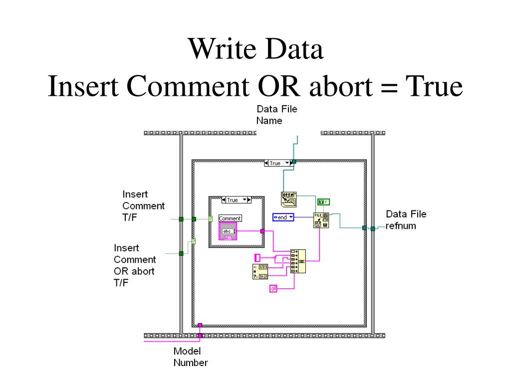 Write Data Block • If “insert comment” and “abort” = false • Calls “Dinamap serial Acquire.vi” • Displays outputted measurements • Passes measurements into “dinamap write.vi” • If “insert comment” = true • Writes comment string + date/time into file • If “abort” = true • Writes “Study Concluded” + date/time into file