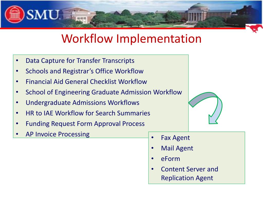 Workflow Implementation • Data Capture for Transfer Transcripts • Schools and Registrar’s Office Workflow • Financial Aid General Checklist Workflow • School of Engineering Graduate Admission Workflow • Undergraduate Admissions Workflows • HR to IAE Workflow for Search Summaries • Funding Request Form Approval Process • AP Invoice Processing • Fax Agent • Mail Agent • eForm • Content Server and Replication Agent