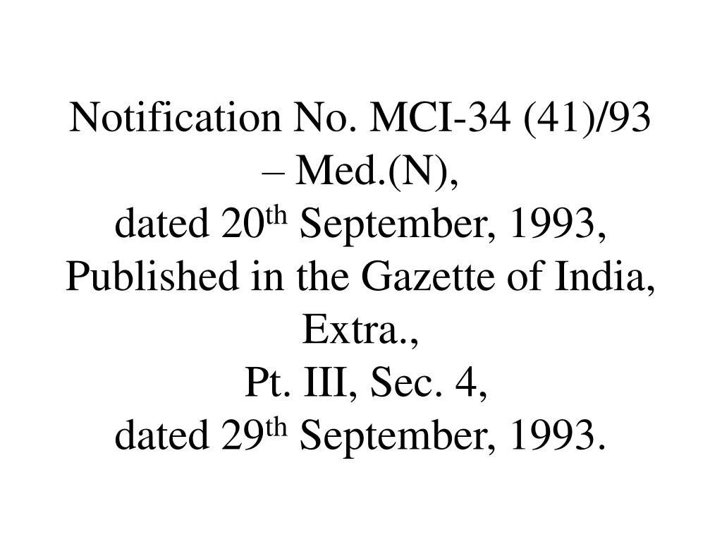 Notification No. MCI-34 (41)/93 – Med.(N), dated 20th September, 1993, Published in the Gazette of India, Extra., Pt. III, Sec. 4, dated 29th September, 1993.