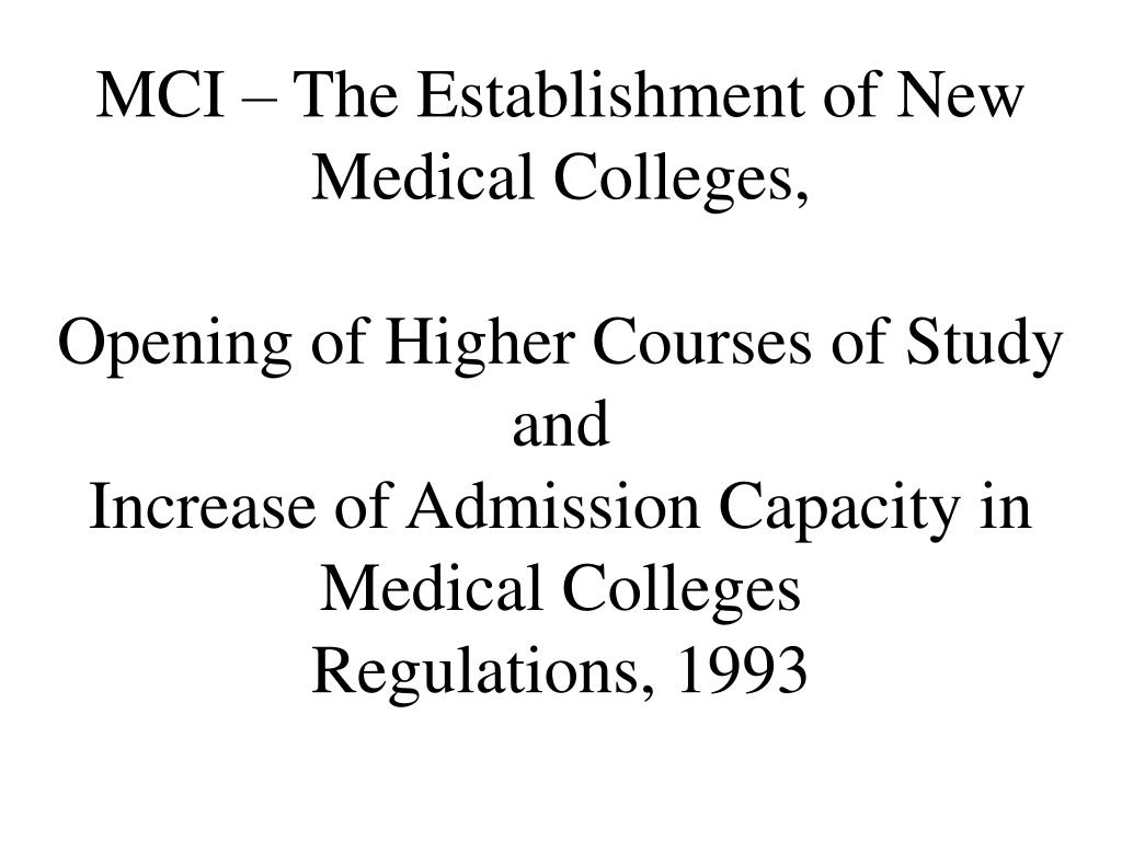 MCI – The Establishment of New Medical Colleges, Opening of Higher Courses of Studyand Increase of Admission Capacity in Medical Colleges Regulations, 1993