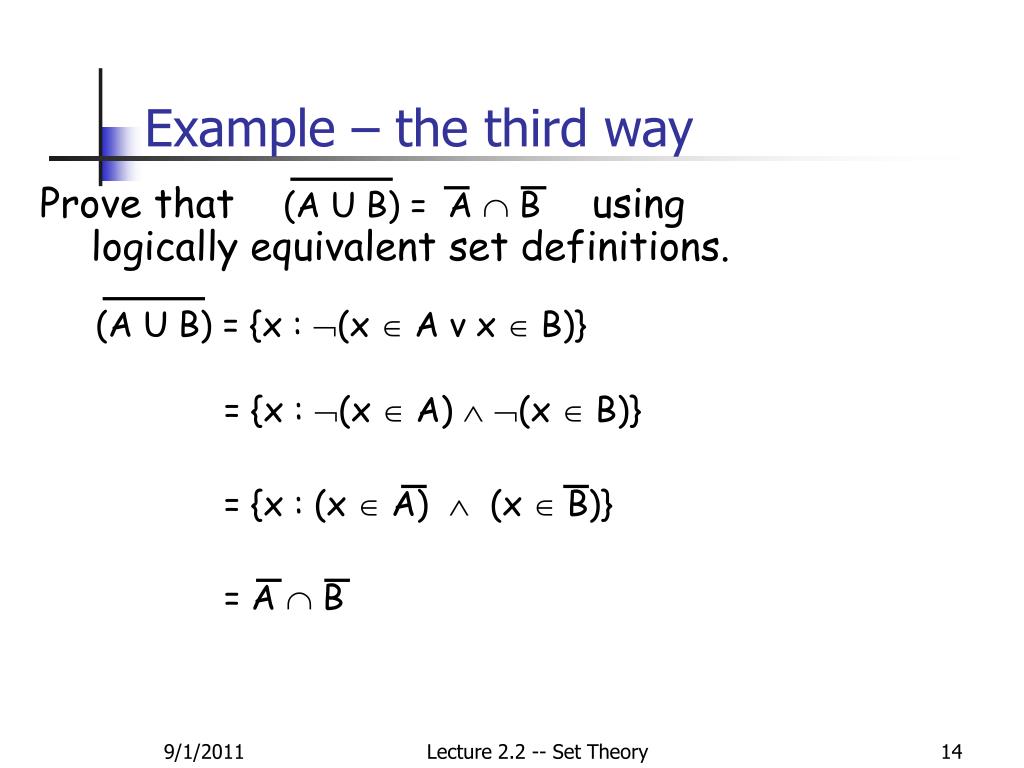 (A UB)= A B (A UB)= {x : (x A v x B)} = A B = {x : (x A) (x B)} Example – the third way Prove that using logically equivalent set definitions. = {x : (x A) (x B)} Lecture 2.2 -- Set Theory