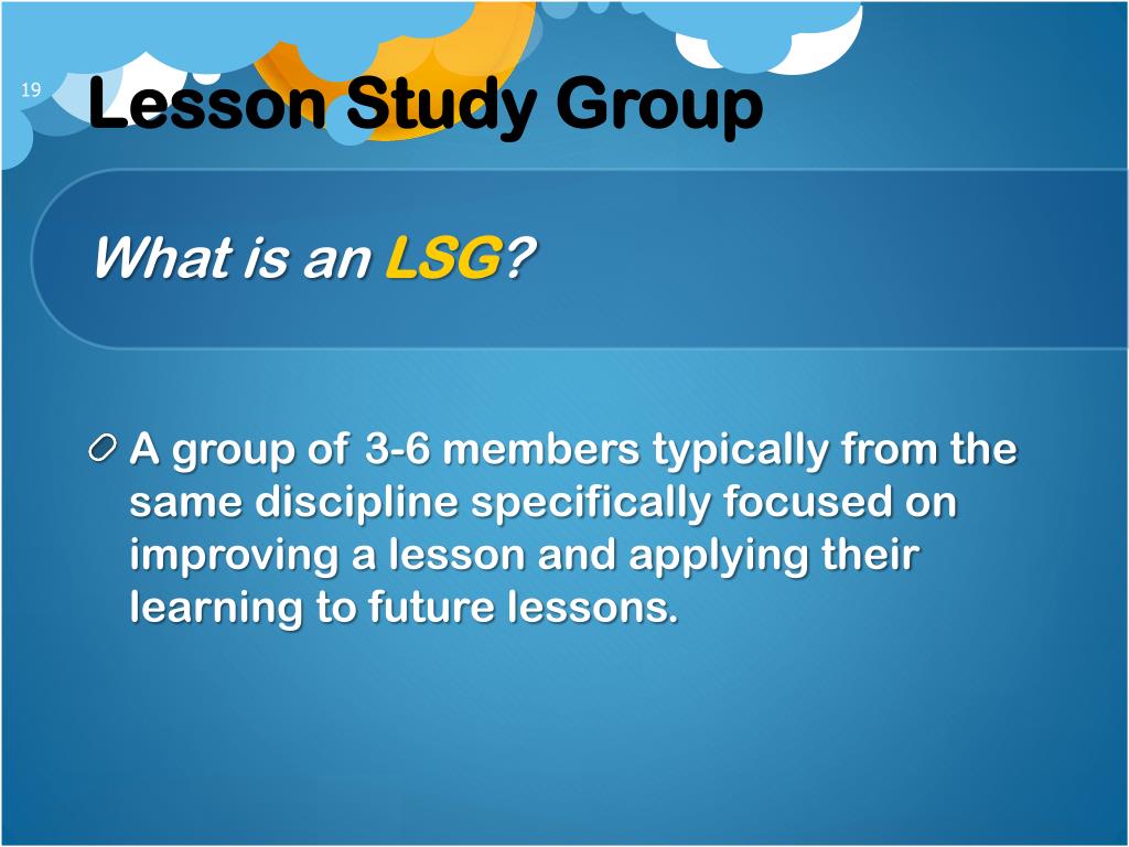 Lesson Study Group What is anLSG? • A group of 3-6 members typically from the same discipline specifically focused on improving a lesson and applying their learning to future lessons.