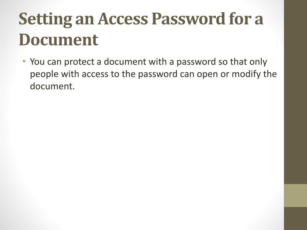 Setting an Access Password for a Document • You can protect a document with a password so that only people with access to the password can open or modify the document.