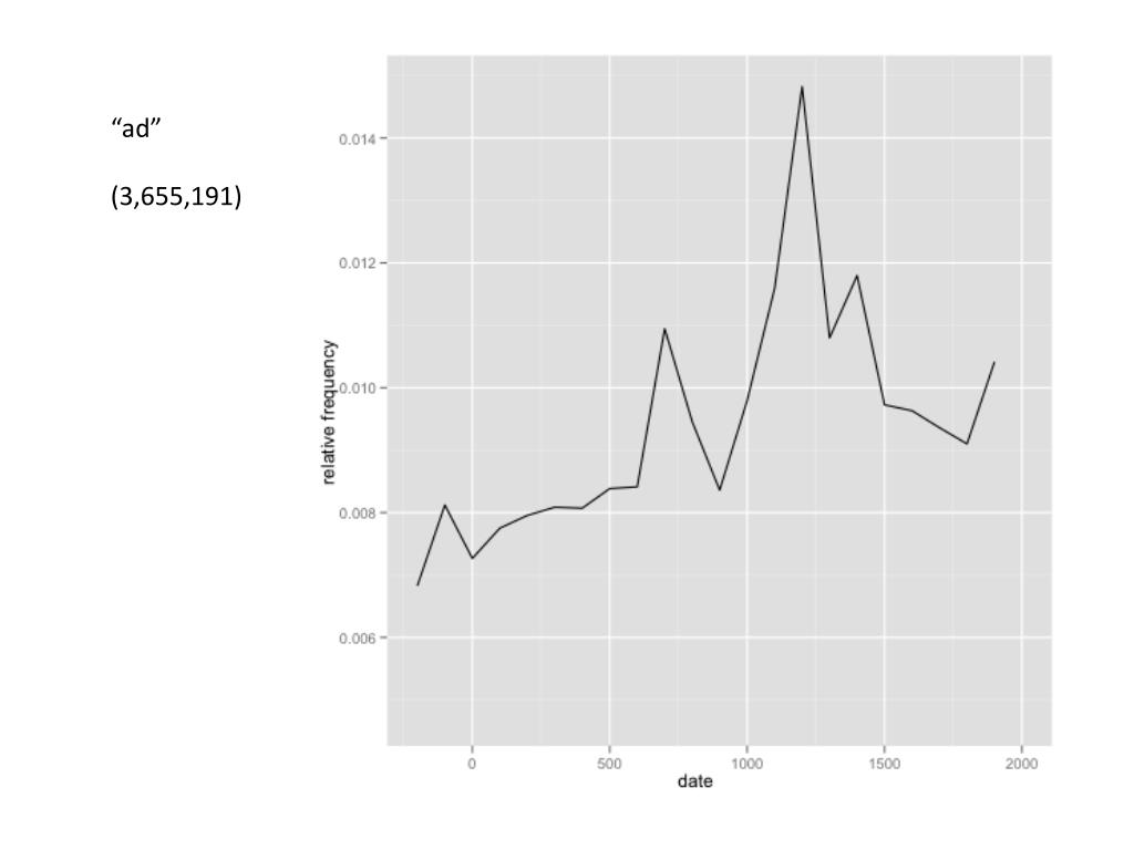 Data • 1.2M books from the Internet Archive (snapshot of collection from 2009) • 27,014 works catalogued as Latin • Problems: 1. Many of these works are not Latin. 2. Recorded dates = dates of publication, not dates of composition.