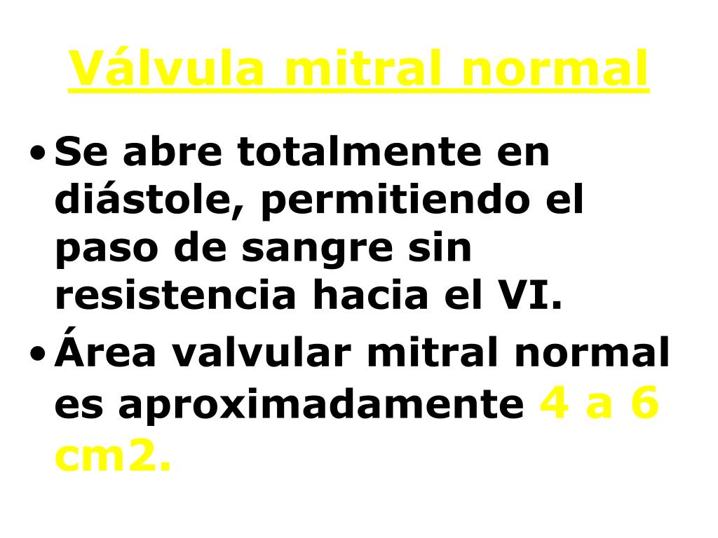 Válvula mitral normal • Se abre totalmente en diástole, permitiendo el paso de sangre sin resistencia hacia el VI. • Área valvular mitral normal es aproximadamente4a 6 cm2.