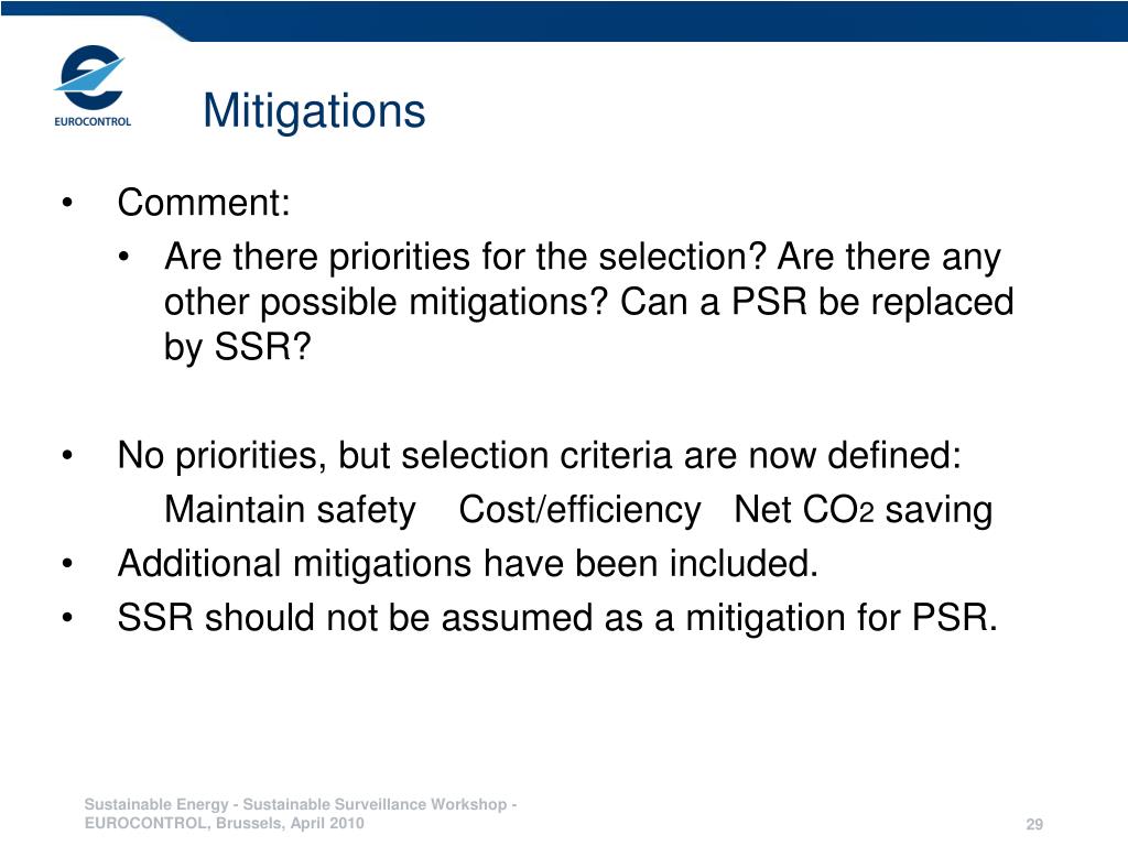 Mitigations • Comment: • Are there priorities for the selection? Are there any other possible mitigations? Can a PSR be replaced by SSR? • No priorities, but selection criteria are now defined: Maintain safety Cost/efficiency Net CO2 saving • Additional mitigations have been included. • SSR should not be assumed as a mitigation for PSR. Sustainable Energy - Sustainable Surveillance Workshop - EUROCONTROL, Brussels, April 2010