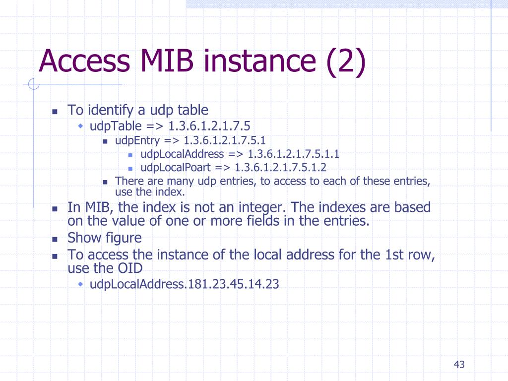 Access MIB instance (2) • To identify a udp table • udpTable => 1.3.6.1.2.1.7.5 • udpEntry => 1.3.6.1.2.1.7.5.1 • udpLocalAddress => 1.3.6.1.2.1.7.5.1.1 • udpLocalPoart => 1.3.6.1.2.1.7.5.1.2 • There are many udp entries, to access to each of these entries, use the index. • In MIB, the index is not an integer. The indexes are based on the value of one or more fields in the entries. • Show figure • To access the instance of the local address for the 1st row, use the OID • udpLocalAddress.181.23.45.14.23