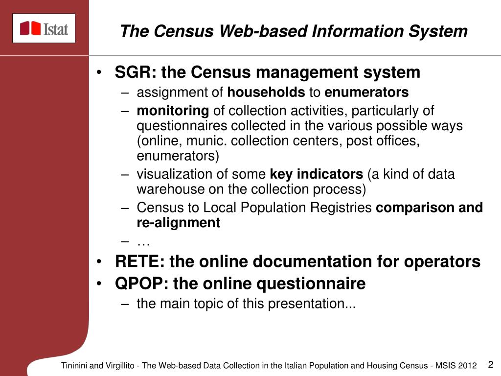 The Census Web-based Information System • SGR: the Census management system • assignment of households to enumerators • monitoring of collection activities, particularly of questionnaires collected in the various possible ways (online, munic. collection centers, post offices, enumerators) • visualization of some key indicators (a kind of data warehouse on the collection process) • Census to Local Population Registriescomparison and re-alignment • … • RETE: the online documentation for operators • QPOP: the online questionnaire • the main topic of this presentation... Tininini and Virgillito - The Web-based Data Collection in the Italian Population and Housing Census - MSIS 2012