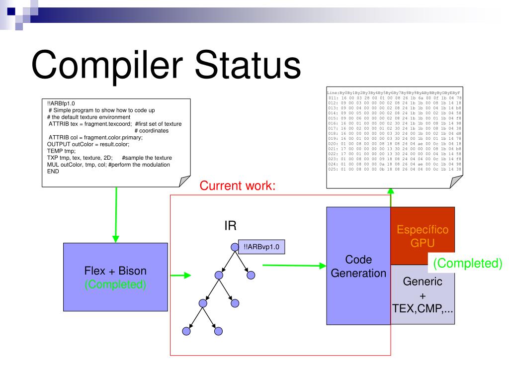 Line:By0By1By2By3By4By5By6By7By8By9ByAByBByByDByEByF 011: 16 00 03 28 00 01 00 08 26 1b 6a 00 0f 1b 04 78 012: 09 00 03 00 00 00 02 08 24 1b 1b 00 08 1b 14 18 013: 09 00 04 00 00 00 02 08 24 1b 1b 00 04 1b 14 b8 014: 09 00 05 00 00 00 02 08 24 1b 1b 00 02 1b 04 58 015: 09 00 06 00 00 00 02 08 24 1b 1b 00 01 1b 04 f8 016: 16 00 01 00 00 00 02 30 24 1b 1b 00 08 1b 14 98 017: 16 00 02 00 00 01 02 30 24 1b 1b 00 08 1b 04 38 018: 16 00 00 00 00 00 03 30 24 00 1b 00 02 1b 04 d8 019: 16 00 01 00 00 00 03 30 24 00 1b 00 01 1b 14 78 020: 01 00 08 00 00 08 18 08 24 04 ae 00 0c 1b 04 18 021: 17 00 00 00 00 00 13 30 24 00 00 00 08 1b 04 b8 022: 17 00 01 00 00 00 13 30 24 00 00 00 04 1b 14 58 023: 01 00 08 00 00 09 18 08 24 04 04 00 0c 1b 14 f8 024: 01 00 08 00 00 0a 18 08 26 04 ae 00 0c 1b 04 98 025: 01 00 08 00 00 0b 18 08 26 04 04 00 0c 1b 14 38 !!ARBfp1.0 # Simple program to show how to code up # the default texture environment ATTRIB tex = fragment.texcoord; #first set of texture # coordinates ATTRIB col = fragment.color.primary; OUTPUT outColor = result.color; TEMP tmp; TXP tmp, tex, texture, 2D; #sample the texture MUL outColor, tmp, col; #perform the modulation END Code Generation Específico GPU Generic + TEX,CMP,... Current work: IR !!ARBvp1.0 Flex + Bison (Completed) (Completed) Compiler Status