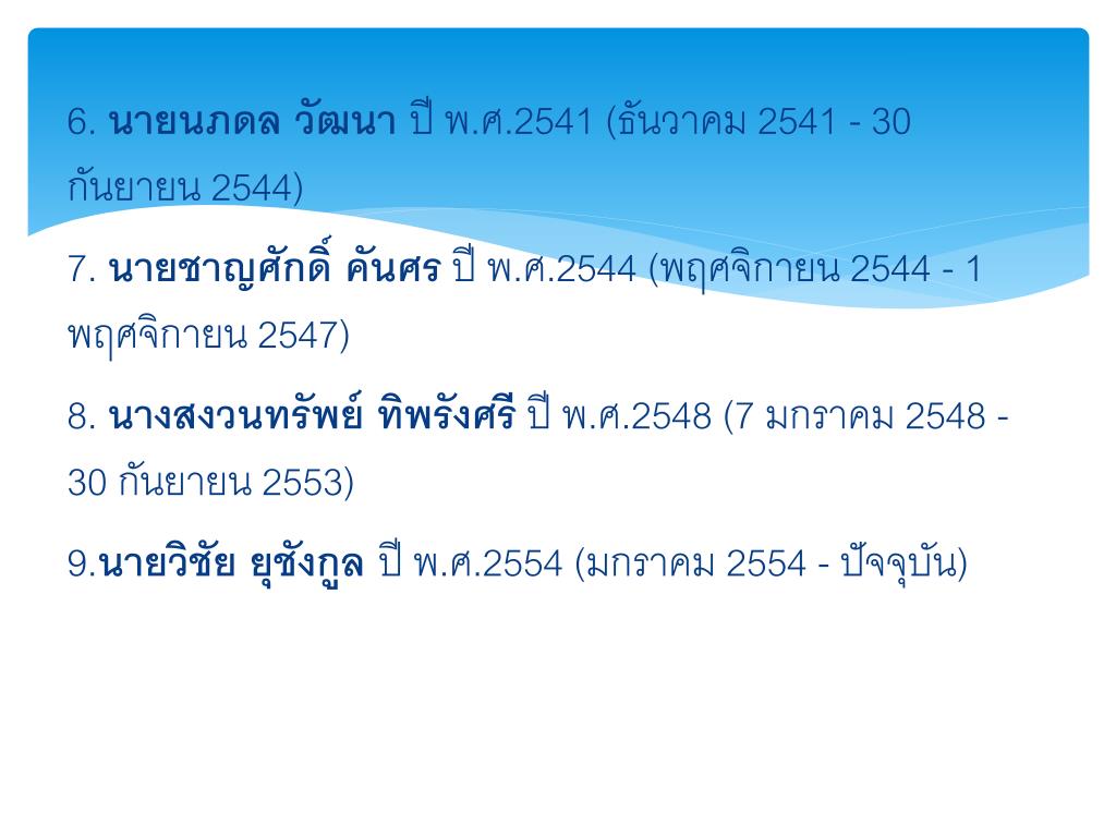 6. นายนภดล วัฒนา ปี พ.ศ.2541 (ธันวาคม 2541 - 30 กันยายน 2544) 7. นายชาญศักดิ์ คันศร ปี พ.ศ.2544 (พฤศจิกายน 2544 - 1 พฤศจิกายน 2547) 8. นางสงวนทรัพย์ ทิพรังศรี ปี พ.ศ.2548 (7 มกราคม 2548 -30 กันยายน 2553) 9.นายวิชัย ยุชังกูลปี พ.ศ.2554 (มกราคม 2554 - ปัจจุบัน)