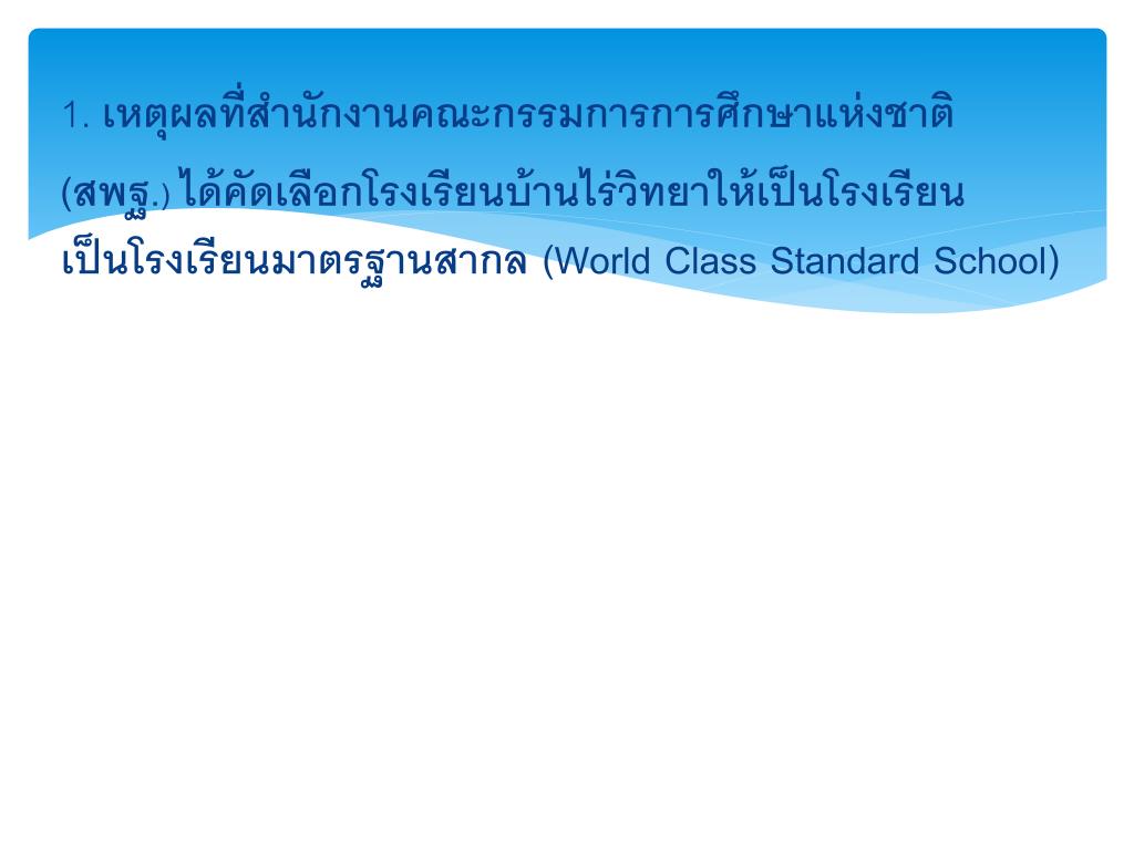 ความเป็นมาของโรงเรียนมาตรฐานสากลความเป็นมาของโรงเรียนมาตรฐานสากล (World Class Standard School) “เป็นเลิศวิชาการ สื่อสารสองภาษา ล้ำหน้าทางความคิด ผลิตงานอย่างสร้างสรรค์ ร่วมกันรับผิดชอบต่อสังคม”