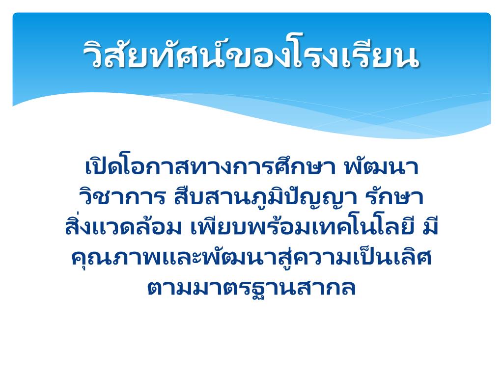 วิสัยทัศน์ของโรงเรียนวิสัยทัศน์ของโรงเรียน เปิดโอกาสทางการศึกษา พัฒนาวิชาการ สืบสานภูมิปัญญา รักษาสิ่งแวดล้อม เพียบพร้อมเทคโนโลยี มีคุณภาพและพัฒนาสู่ความเป็นเลิศตามมาตรฐานสากล