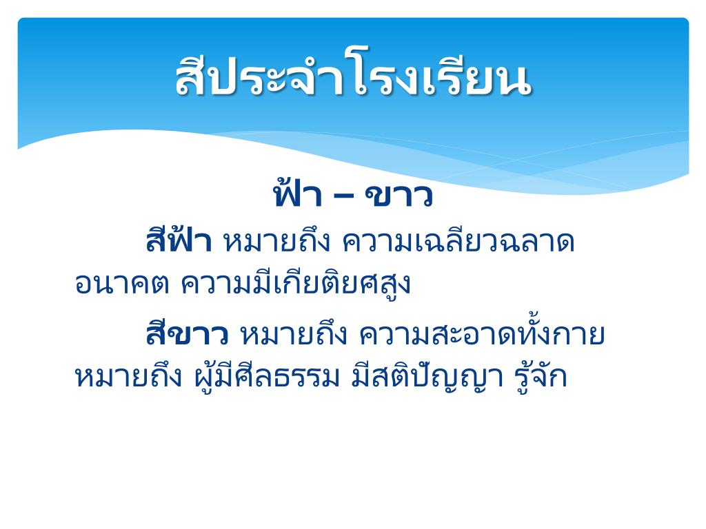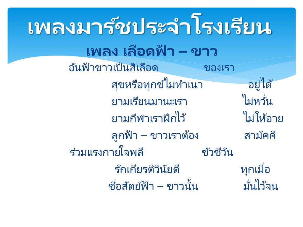 เพลงมาร์ชประจำโรงเรียนเพลงมาร์ชประจำโรงเรียน เพลง เลือดฟ้า – ขาว อันฟ้าขาวเป็นสีเลือด ของเรา สุขหรือทุกข์ไม่ทำเนา อยู่ได้ ยามเรียนมานะเรา ไม่หวั่น ยามกีฬาเราฝึกไว้ ไม่ให้อายใคร ลูกฟ้า – ขาวเราต้อง สามัคคี ร่วมแรงกายใจพลี ชั่วชีวัน รักเกียรติวินัยดี ทุกเมื่อ ซื่อสัตย์ฟ้า – ขาวนั้น มั่นไว้จนตาย