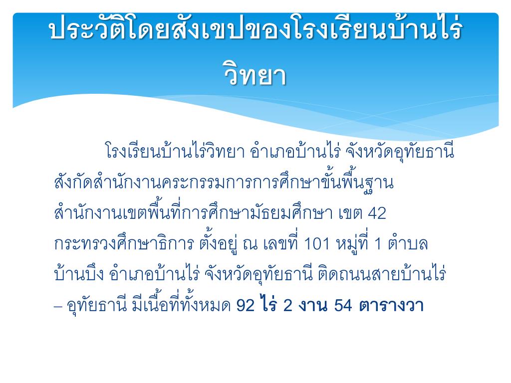 ประวัติโดยสังเขปของโรงเรียนบ้านไร่วิทยาประวัติโดยสังเขปของโรงเรียนบ้านไร่วิทยา โรงเรียนบ้านไร่วิทยา อำเภอบ้านไร่ จังหวัดอุทัยธานี สังกัดสำนักงานคระกรรมการการศึกษาขั้นพื้นฐาน สำนักงานเขตพื้นที่การศึกษามัธยมศึกษา เขต 42 กระทรวงศึกษาธิการ ตั้งอยู่ ณ เลขที่ 101 หมู่ที่ 1 ตำบลบ้านบึง อำเภอบ้านไร่ จังหวัดอุทัยธานี ติดถนนสายบ้านไร่ – อุทัยธานี มีเนื้อที่ทั้งหมด 92 ไร่ 2 งาน 54 ตารางวา